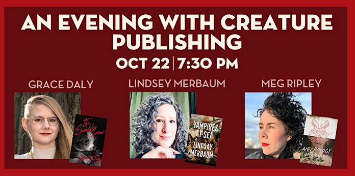 Grace Daly (THE SCALD-CROW), Lindsey Merbaum (VAMPIRES AT SEA) & Meg Ripley (NECROLOGY) with Will Roth Wednesday, October 22, 2025 7:30 PM 8:30 PM Greenlight Bookstore 686 Fulton Street Brooklyn, NY, 11217 (map) Google Calendar ICS Learn more