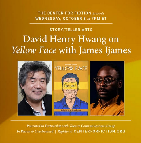 David Henry Hwang (YELLOW FACE) with James Ijames Wednesday, October 8, 2025 7:00 PM 8:15 PM The Center for Fiction 15 Lafayette Avenue Brooklyn, NY, 11217 (map) Google Calendar ICS Learn more