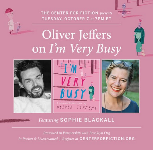 Oliver Jeffers (I’M VERY BUSY) launch with Sophie Blackall Tuesday, October 7, 2025 7:00 PM 8:15 PM The Center for Fiction 15 Lafayette Avenue Brooklyn, NY, 11217 (map) Google Calendar ICS Learn more