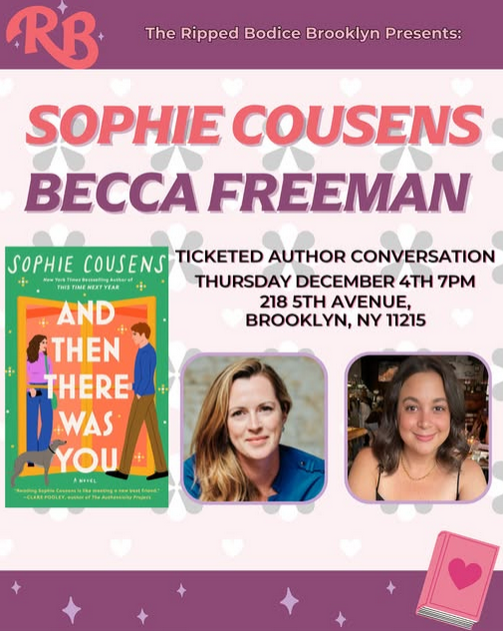 Back to All Events Sophie Cousens (AND THEN THERE WAS YOU) w/Becca Freeman Thursday, December 4, 2025 7:00 PM 9:00 PM The Ripped Bodice 218 5th Ave Brooklyn, NY, 11215 (map) Google Calendar ICS Learn more